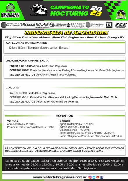 La actividad se iniciará la noche del viernes a las 20:00hs con la realización de las inscripciones, para desde las 21:15 hs se dará inicio a los Entrenamientos Oficiales.