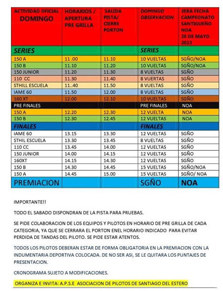 A las 12:30 será el turno de la prefinal NOA: 150 B, 12 vueltas; 150 A; 12 vueltas. Y las finales a las 13:30: Iame 60cc, 12 vueltas; Stihl, 8 vueltas; 110cc, 12 vueltas, 150 Jr, 12 vueltas; 160 XT, 14 vueltas; 150 B, 15 vueltas. Por el (Sgño./NOA): 150 A, 15 vueltas (Sgño./NOA). Al finalizar se realizará la tradicional entrega de premios.