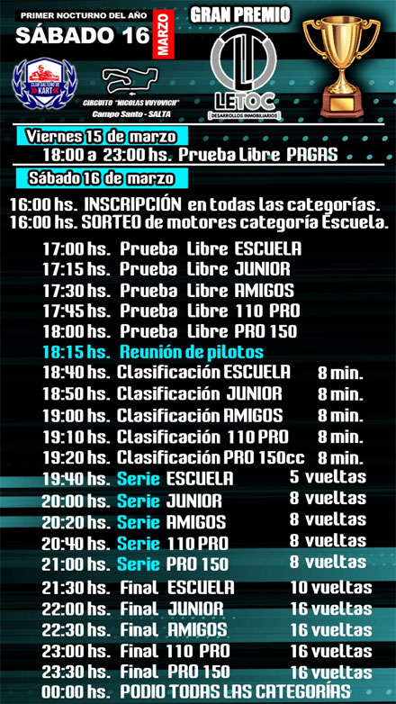 El inicio de actividad está previsto para el sábado 16 de marzo y la actividad en pista será a partir de las 17:00 hs. con pruebas libres. El diagrama de carreras establece clasificación, series en el espacio intermedio, mientras que las finales se correrán desde las 21:30 hs.