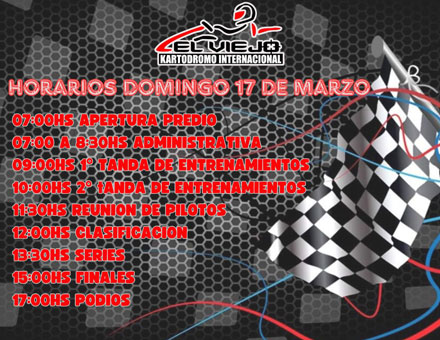 La jornada de competición comenzará temprano en el kartódromo, con la actividad administrativa a partir de las 07:00 horas. Los entrenamientos, divididos en dos tandas, darán inicio a las 09:00 horas, seguidos de la clasificación a las 12:00 horas, las series a las 13:30 horas y las finales a partir de las 15:00 horas.