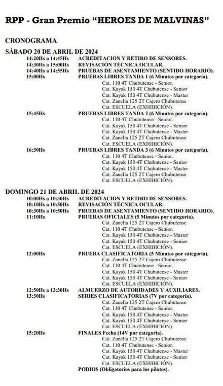 El sábado 20, la acción comenzará a las 14:20 horas con los protocolos habituales, seguidos de las pruebas libres desde las 15:00 horas. El domingo 21 por su parte se llevarán a cabo las clasificaciones, las series y las finales, que determinarán a los ganadores de cada categoría.