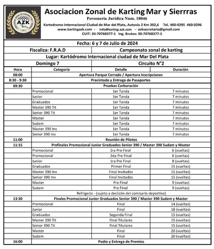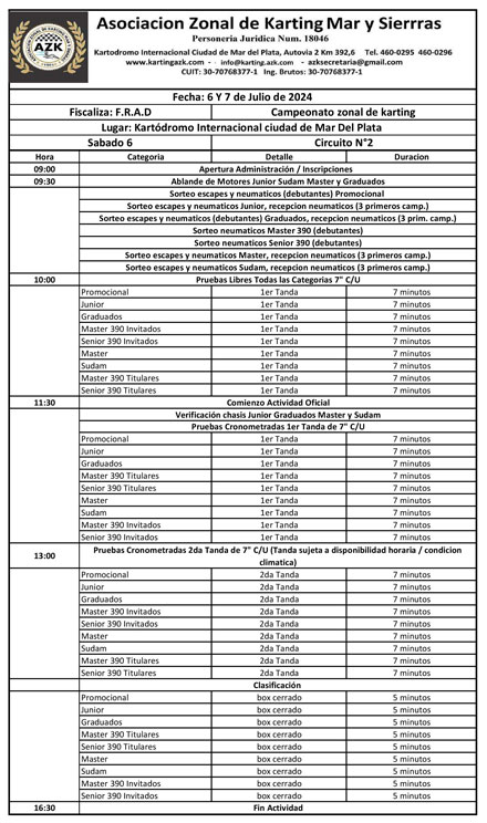 Las siete categorías de la Asociación Zonal de Kart (AZK) realizarán pruebas libres (desde las 10., dos tandas de pruebas cronometradas (a las 11.30 y a las 13. y clasificación (desde las 15. este sábado, en el Kartódromo Internacional “Ciudad de Mar del Plata”.