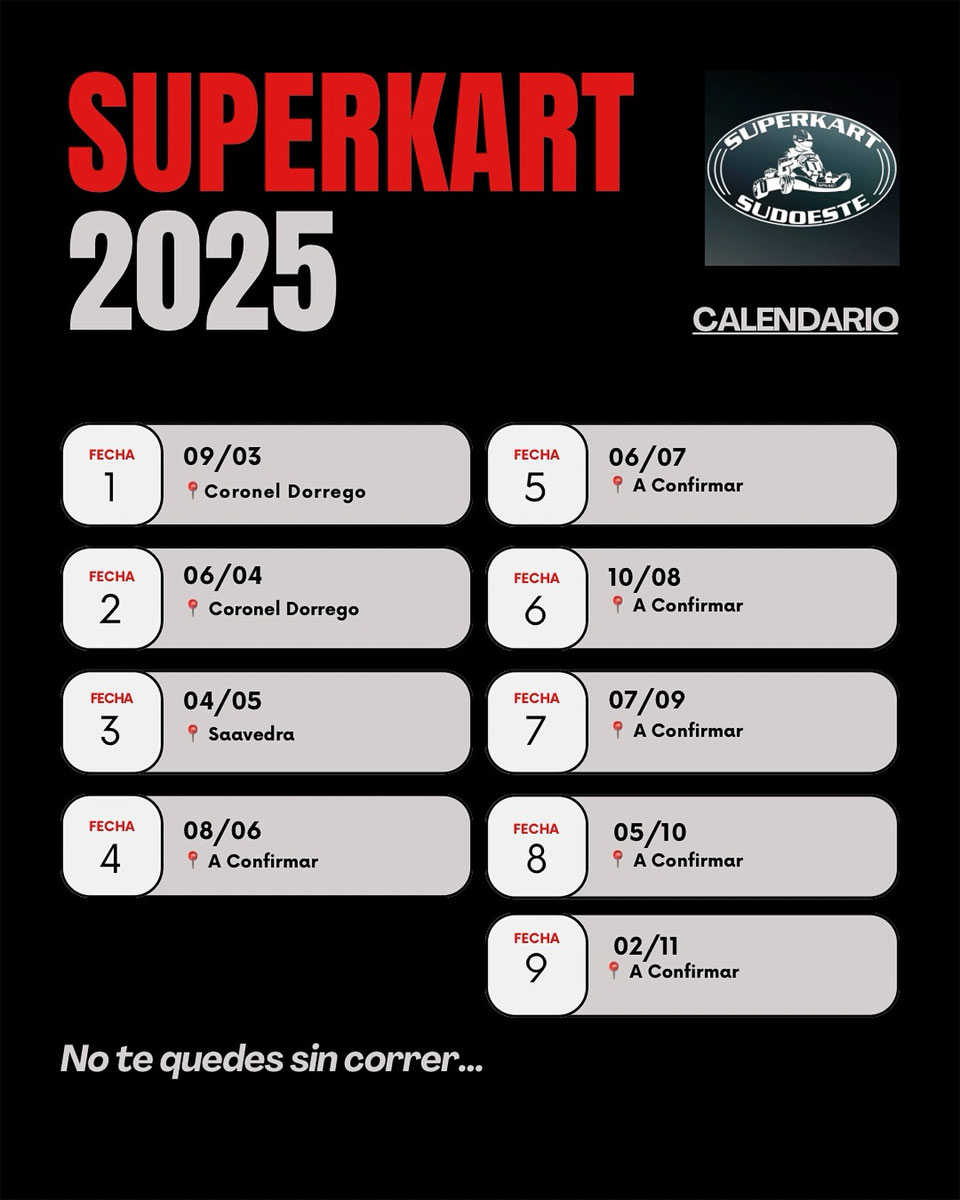 El Superkart del Sudoeste (SKSO) Bonaerense dio a conocer el calendario de su temporada 2025, que contará con nueve fechas.