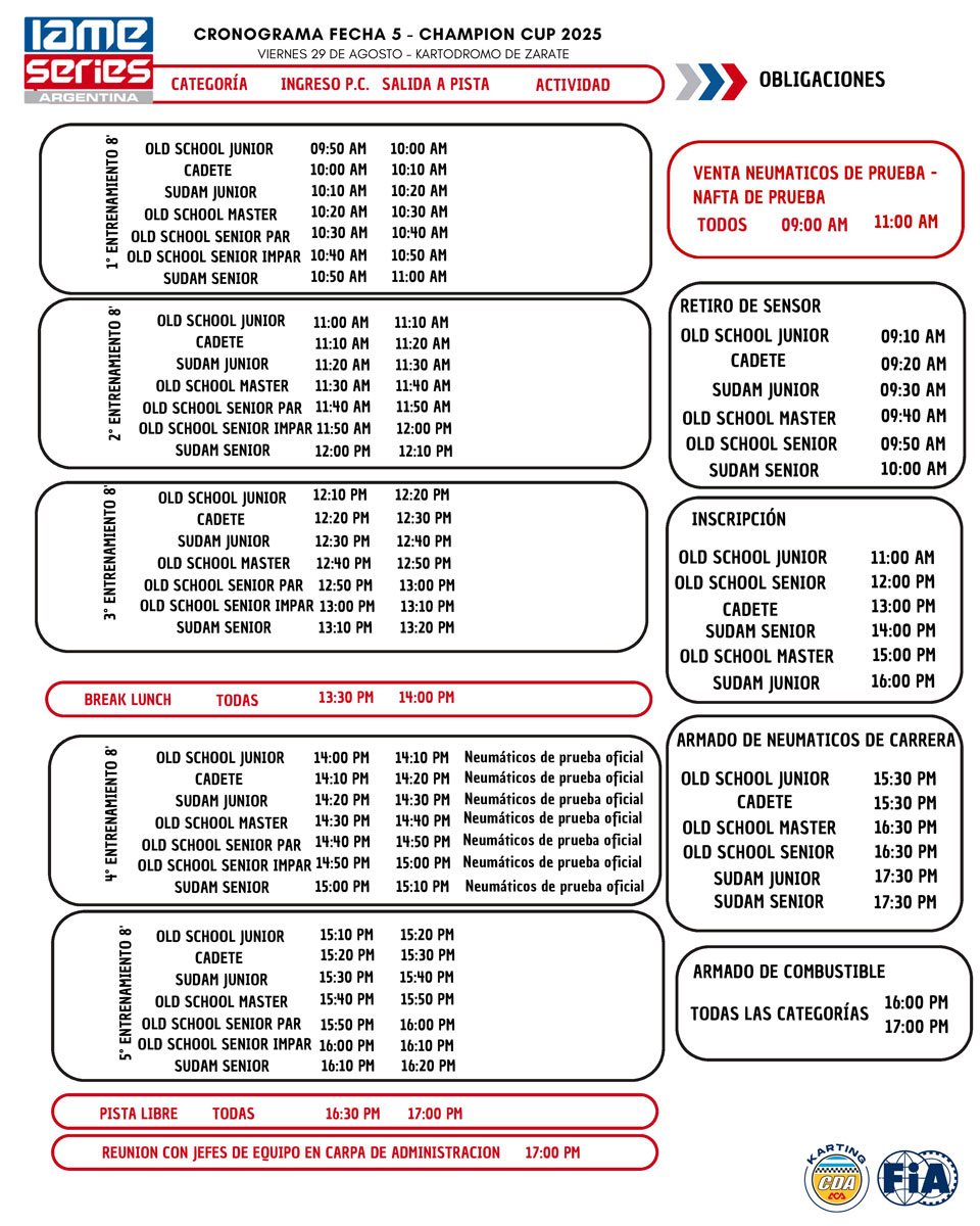 El viernes 29 de agosto estará destinado a los entrenamientos libres. Desde la mañana y hasta la tarde, cada una de las categorías tendrá cinco tandas de ocho minutos para poner a punto los kartings, además de los momentos obligatorios de retiro de sensores, armado de neumáticos y el abastecimiento de combustible que será controlado por la organización.