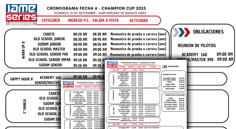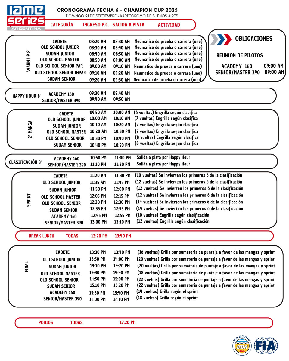 Finalmente el domingo 21 quedará reservado para la definición. Desde temprano habrá warm up, seguidos por las segundas mangas, los Sprint con grilla invertida y, por la tarde, las finales que pondrán en juego los últimos puntos de la Etapa Regular. El cierre de la jornada está previsto con la ceremonia de podios a las 17:20.