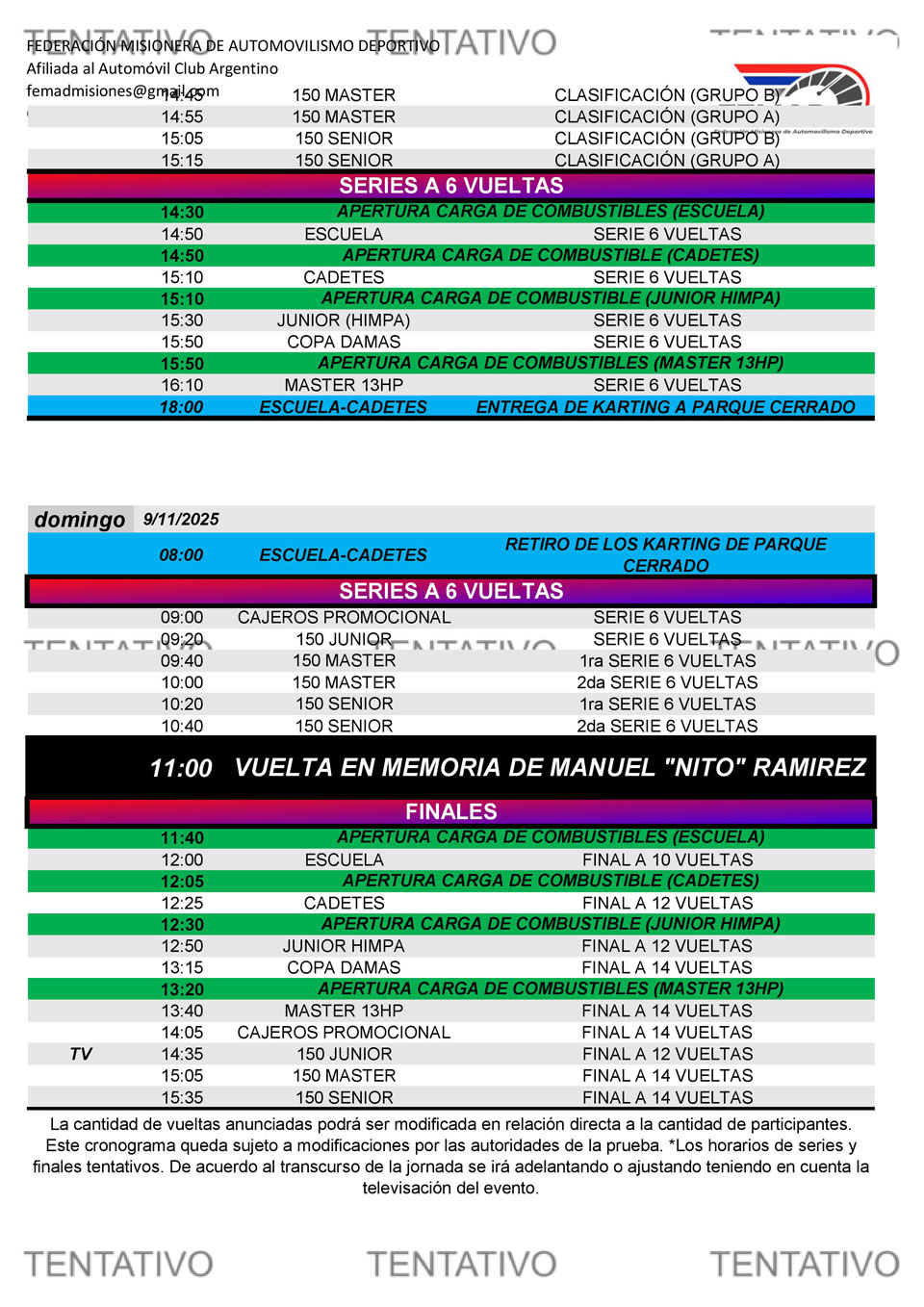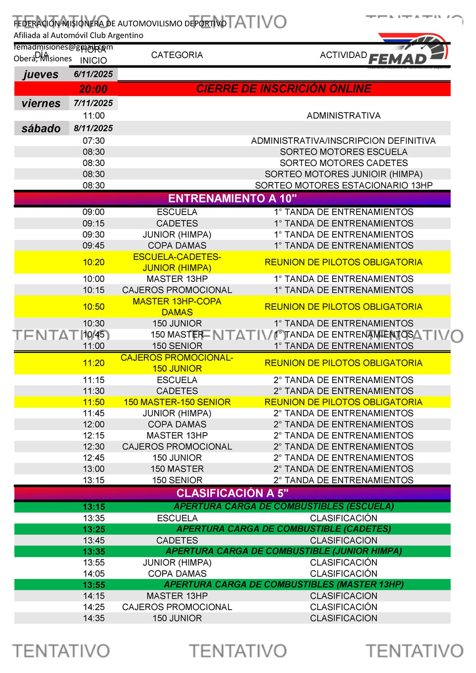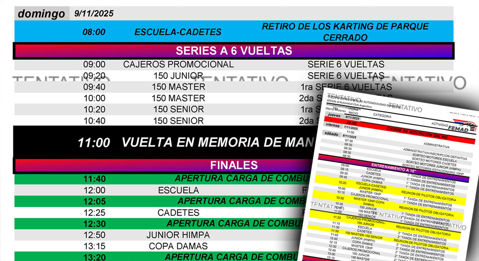 La Federación Misionera de Automovilismo Deportivo (FeMAD) dio a conocer el cronograma tentativo que regirá la octava fecha del certamen, que promete una agenda cargada desde el inicio de las actividades administrativas hasta las finales del domingo.