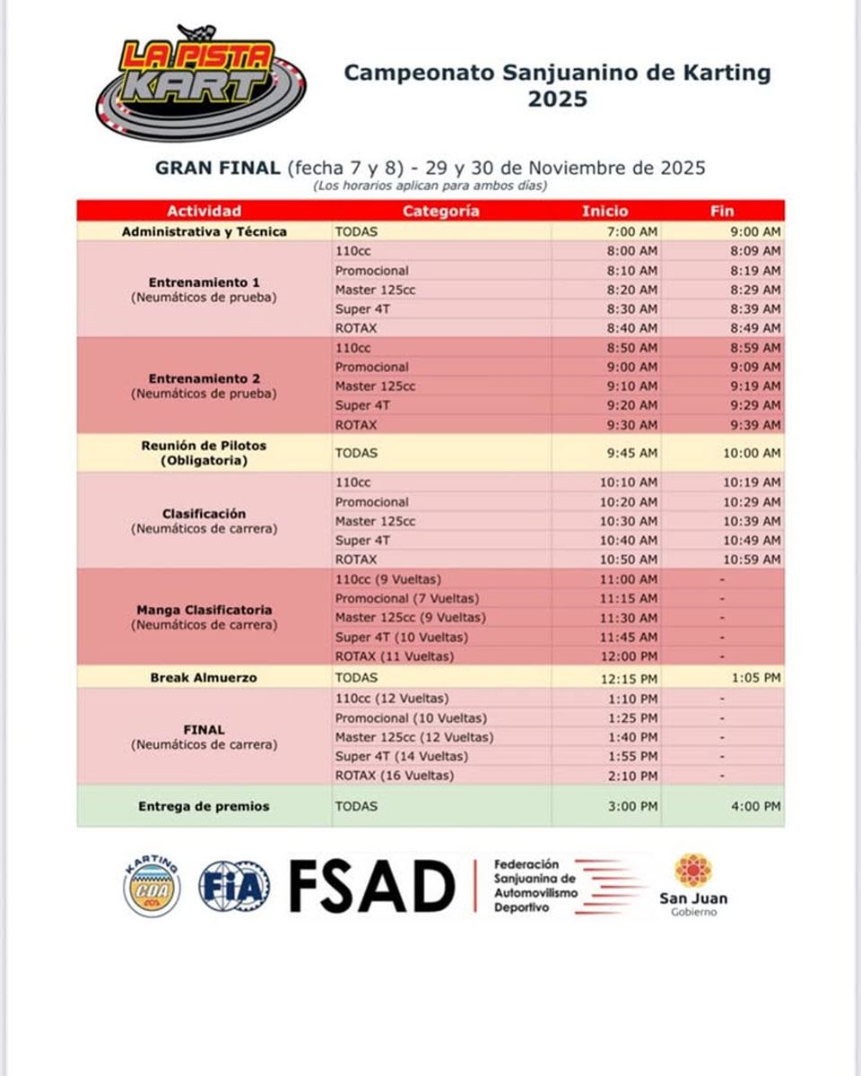 El Campeonato Sanjuanino de Karting vivirá este sábado 29 y domingo 30 de noviembre su última y decisiva doble fecha, donde se disputarán las jornadas 7 y 8 del calendario.