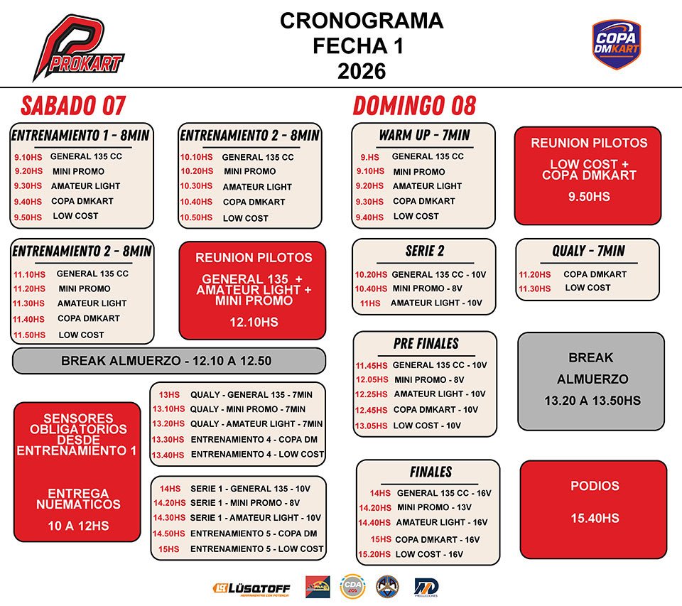 Las finales se desarrollarán durante la tarde y definirán a los primeros ganadores de la temporada, mientras que la ceremonia de podios está prevista para el cierre de la actividad. De esta manera quedará oficialmente inaugurado el campeonato 2026 para ambas propuestas del karting metropolitano.