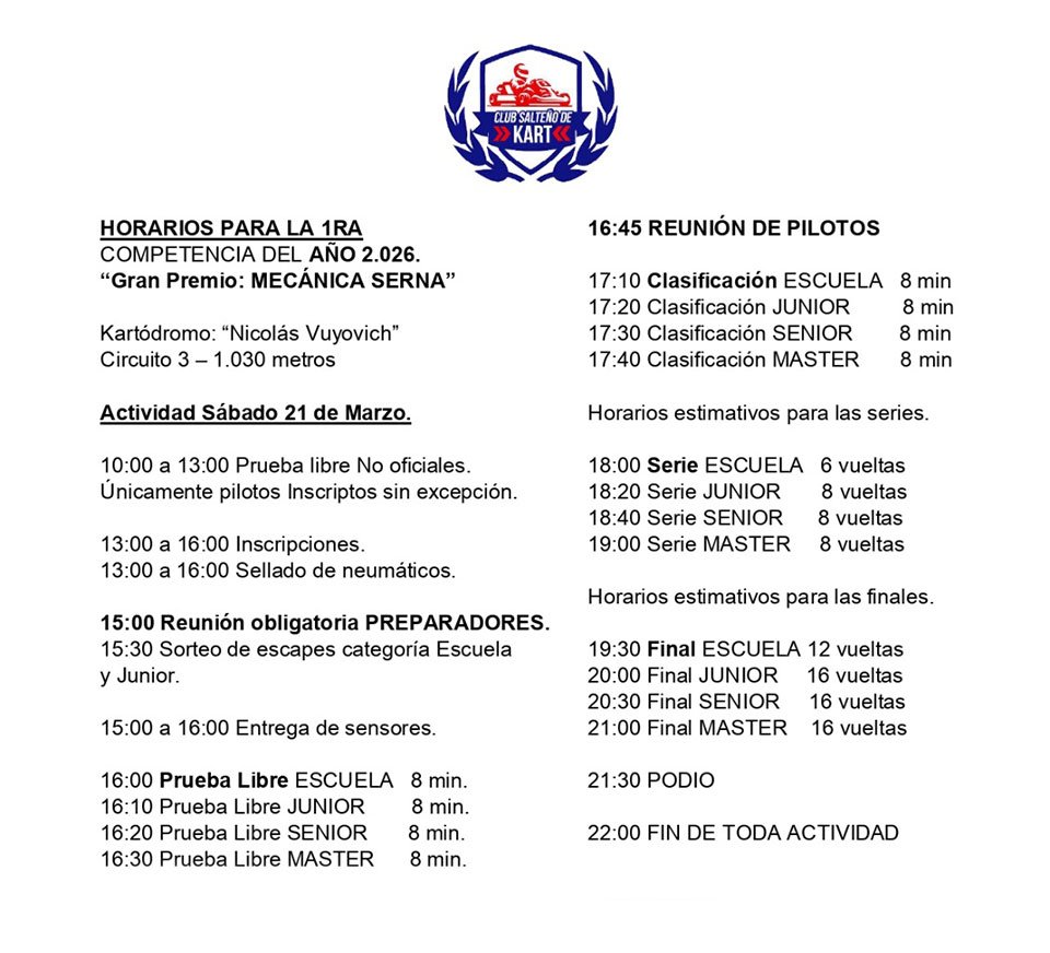 Con la salida a pista de cuatro categorías, este fin de semana dará inicio la temporada 2026 del karting salteño en el kartódromo “Nicolás Vuyovich”, localidad de Campo Santo. En la oportunidad estará en juego el “Gran Premio: Mecánica SERNA”, primera fecha del calendario.