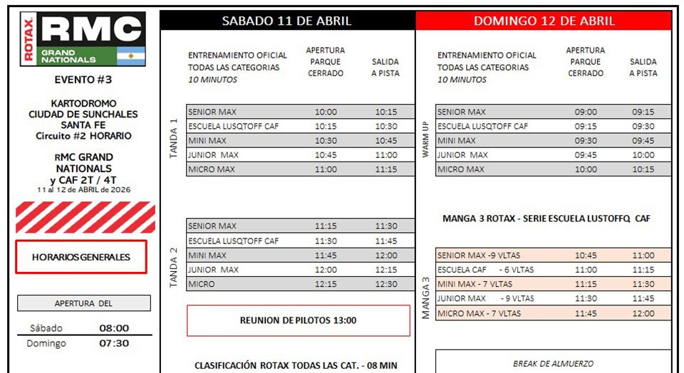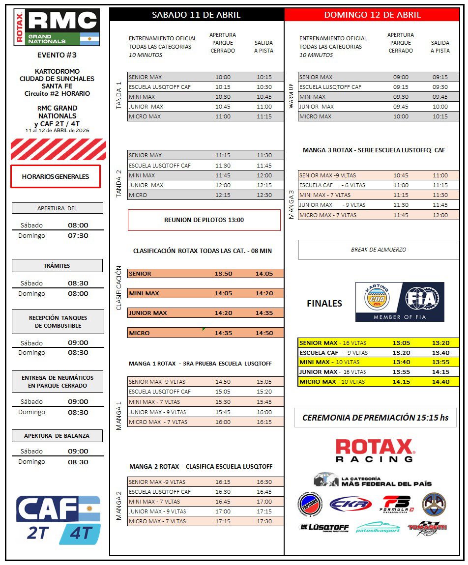 La actividad comenzará el sábado con entrenamientos oficiales desde las 10:00 para todas las divisionales. Luego, desde las 13:50, se llevarán a cabo las clasificaciones de las categorías Rotax. Posteriormente se disputarán la primera y segunda manga, y una vez finalizadas estas, será el turno de las clasificaciones para las divisionales del CAF.
