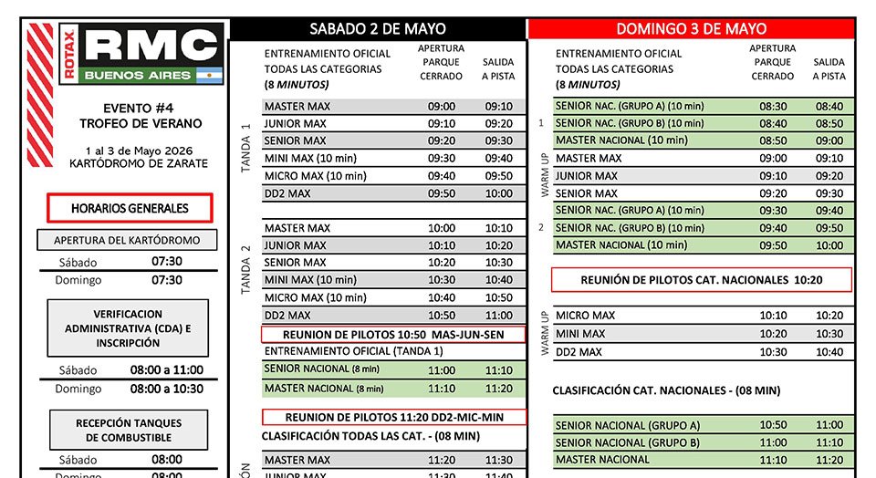 De esta manera, RMC Buenos Aires estructura un fin de semana con cronograma compacto y escalonado, asegurando orden en pista y continuidad de actividad en cada jornada.