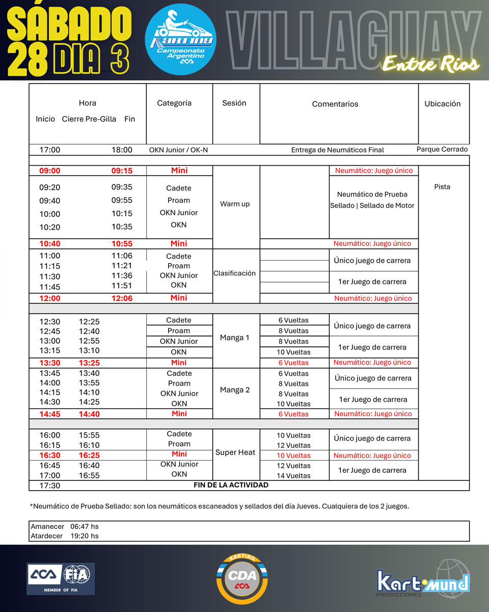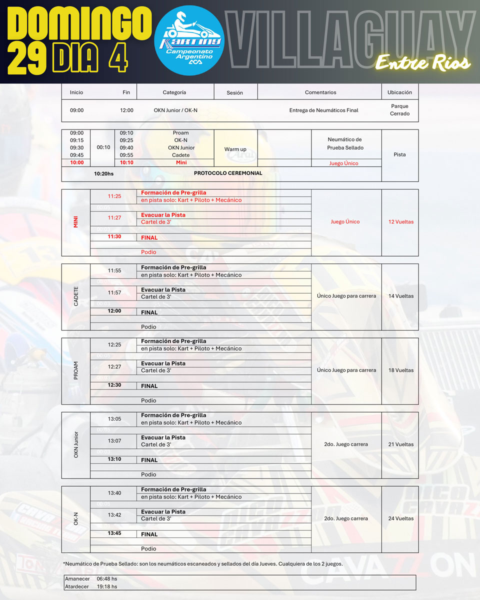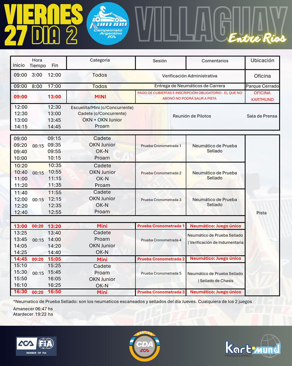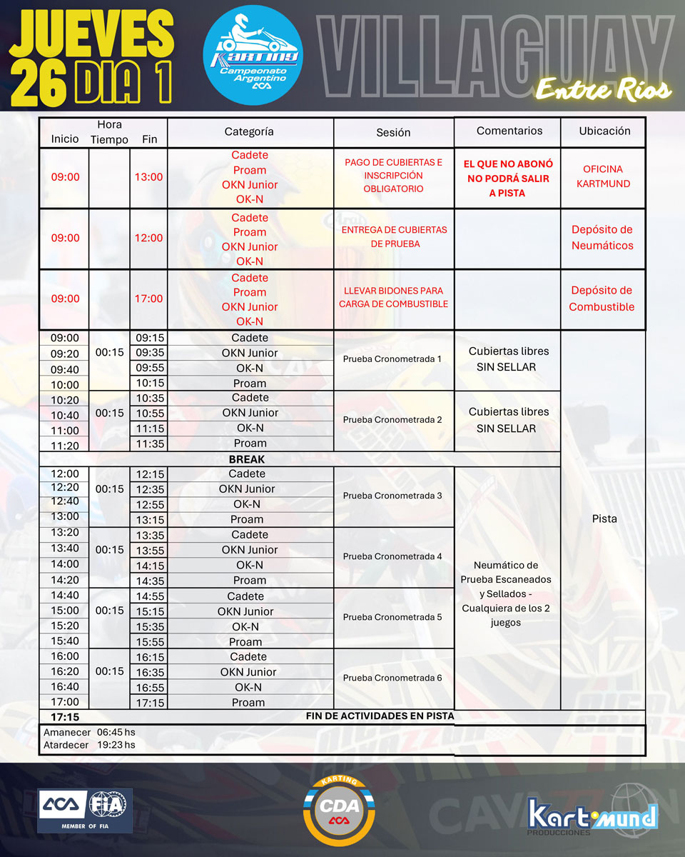 El jueves se abrirá la acción con pruebas cronometradas para Cadete, Proam, OKN Junior y OKN. Durante la jornada también se realizarán inscripciones, entrega de cubiertas y carga de combustible. Cada divisional tendrá seis tandas en pista.