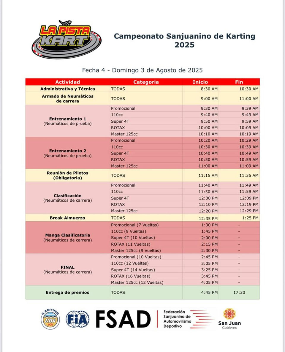 Con la organización de los responsables del circuito, la fiscalización de FESAD y el apoyo del Gobierno de San Juan, este próximo fin de semana se disputará la cuarta fecha del Campeonato Sanjuanino de Karting, uno de los eventos más esperados del deporte motor local. El escenario será La Pista Kart, ubicada en el departamento Pocito, sobre Ruta 40 entre calles 9 y 10.