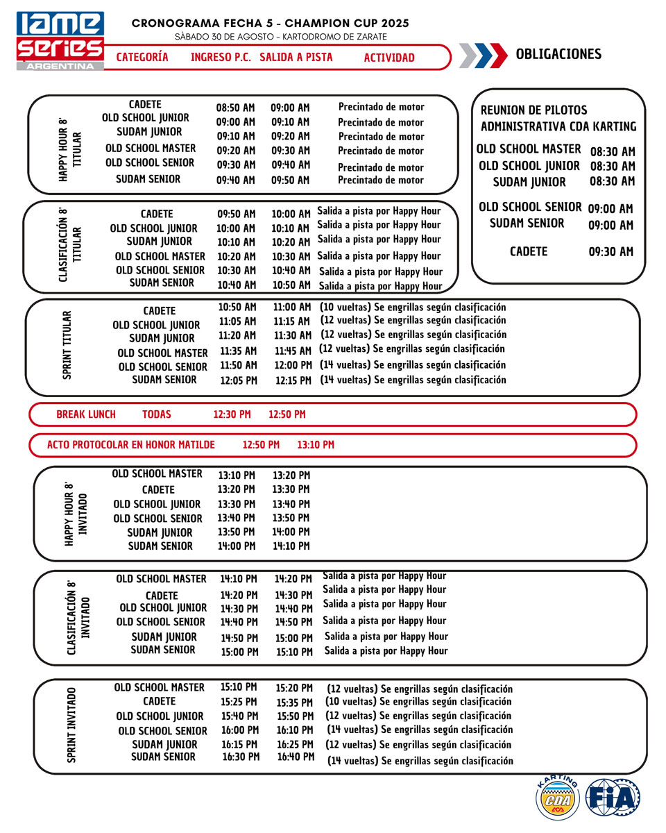 El viernes 29 de agosto estará destinado a los entrenamientos libres. Desde la mañana y hasta la tarde, cada una de las categorías tendrá cinco tandas de ocho minutos para poner a punto los kartings, además de los momentos obligatorios de retiro de sensores, armado de neumáticos y el abastecimiento de combustible que será controlado por la organización.