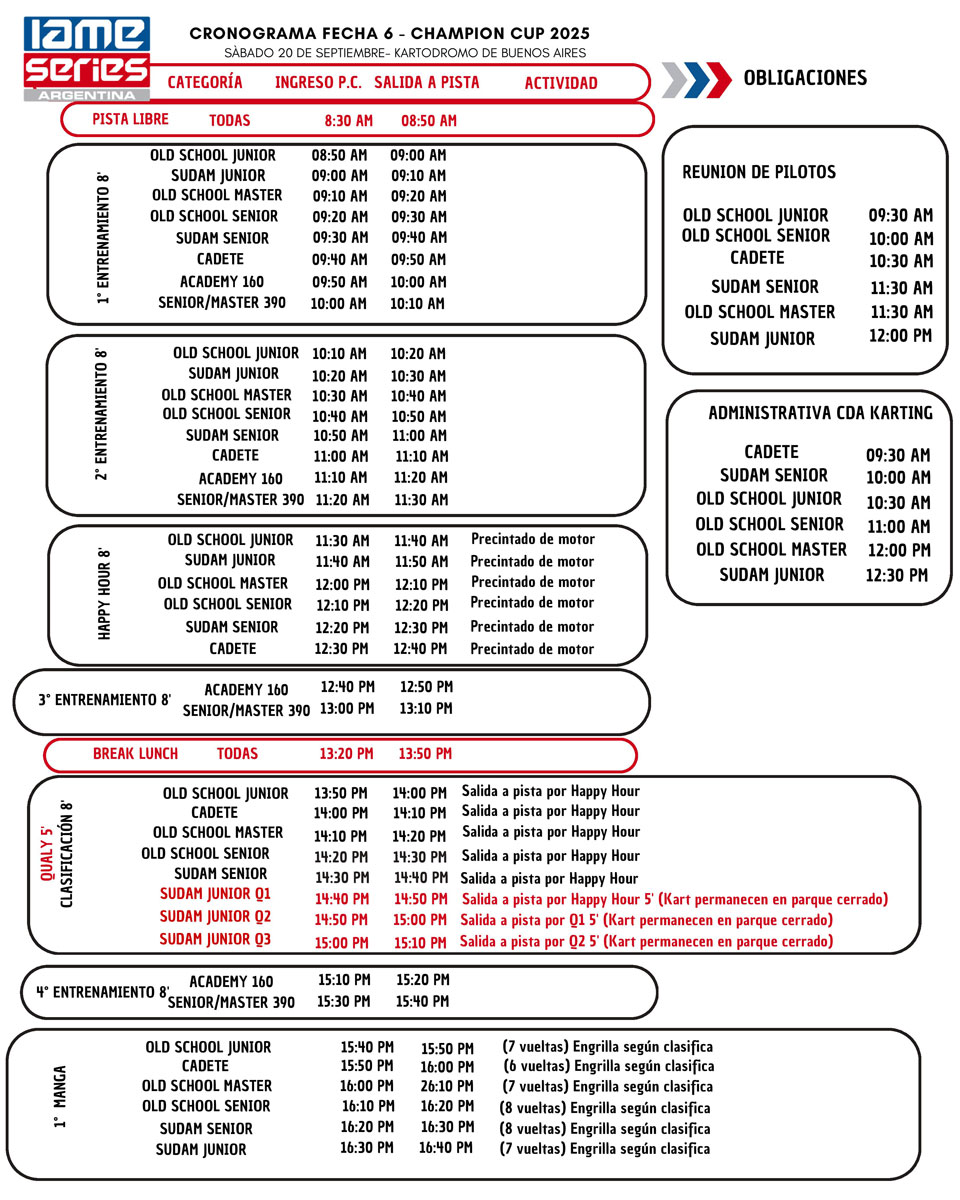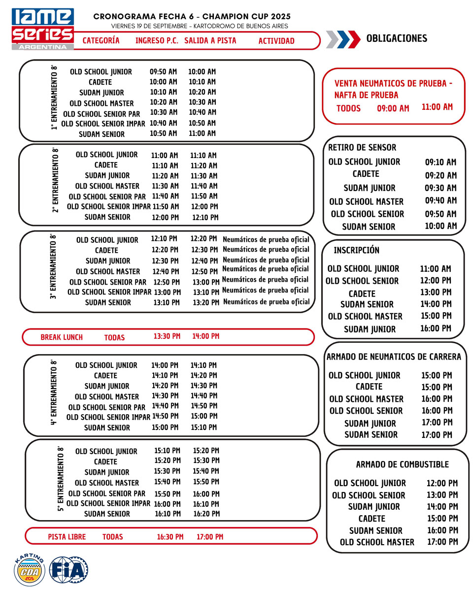 La actividad se pondrá en marcha el viernes 19, con tandas de entrenamientos para todas las categorías. Ese día también se realizarán las inscripciones, retiro de sensores y armado de neumáticos y combustible, de cara a un sábado que marcará el inicio formal de la competencia.
