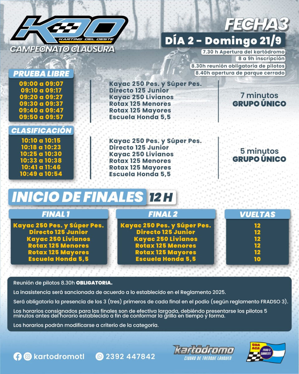 Como ya es habitual, el día sábado se realizarán tres tandas de entrenamientos por categoría, mientras que para el domingo está previsto desarrollar una tanda de pruebas libres, clasificaciones y finales para todas las categorías.