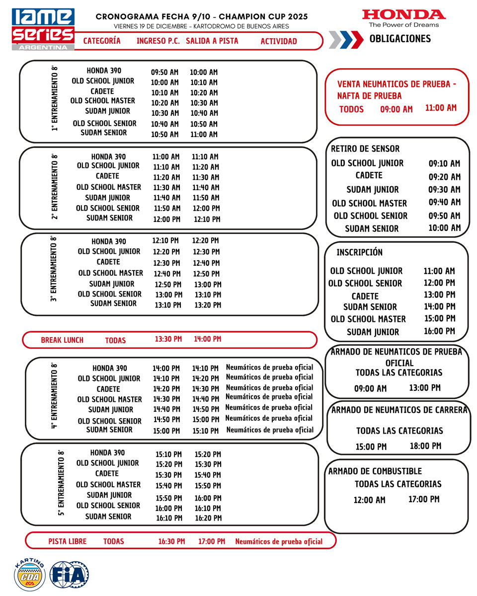 La actividad comenzará el viernes 19 de diciembre, jornada dedicada por completo a los entrenamientos oficiales, con cinco tandas por categoría desde las 10:00 y hasta pasadas las 16:00. Además, se realizarán las inscripciones, el armado de neumáticos y el retiro de sensores, en una jornada clave de preparación para lo que viene.