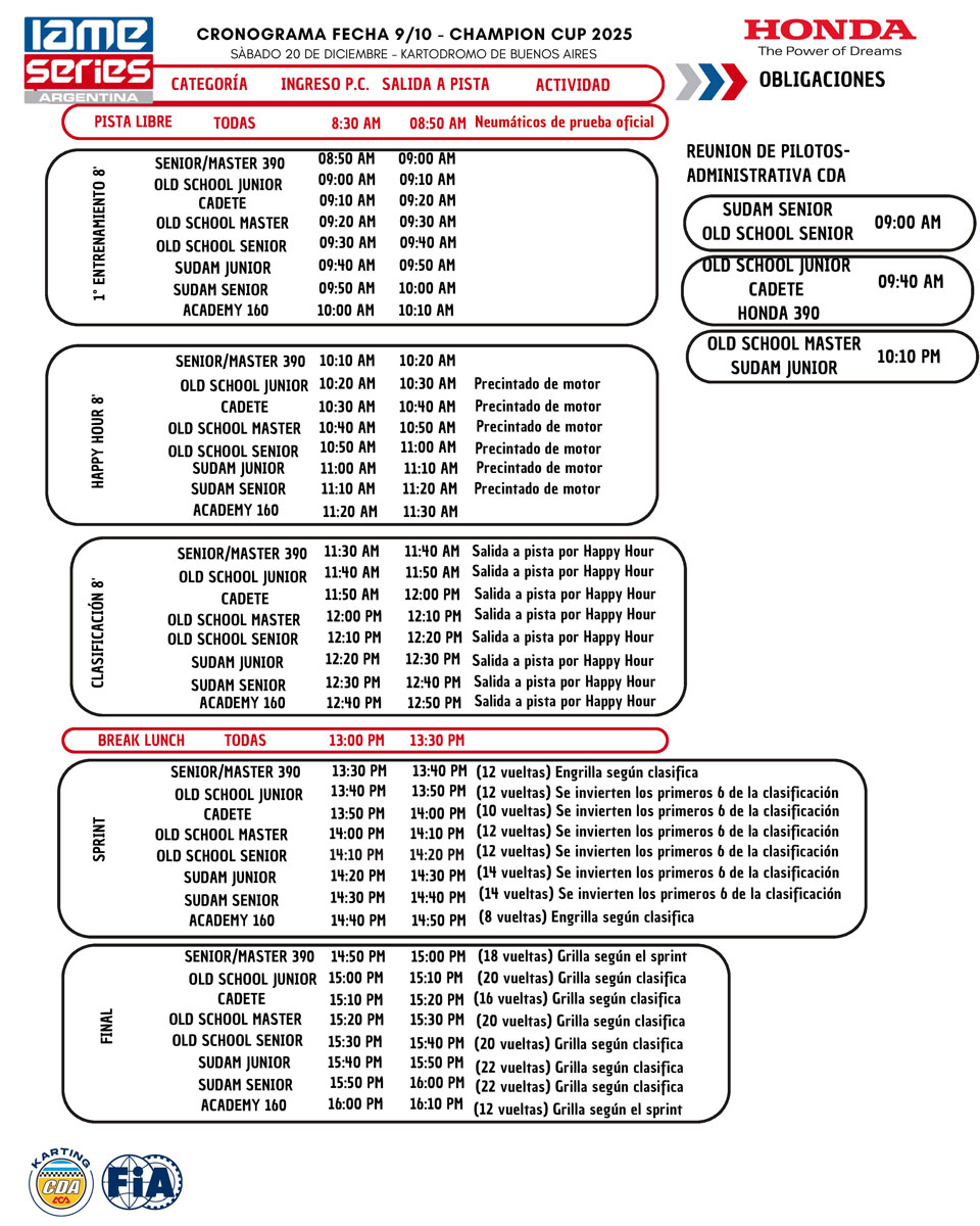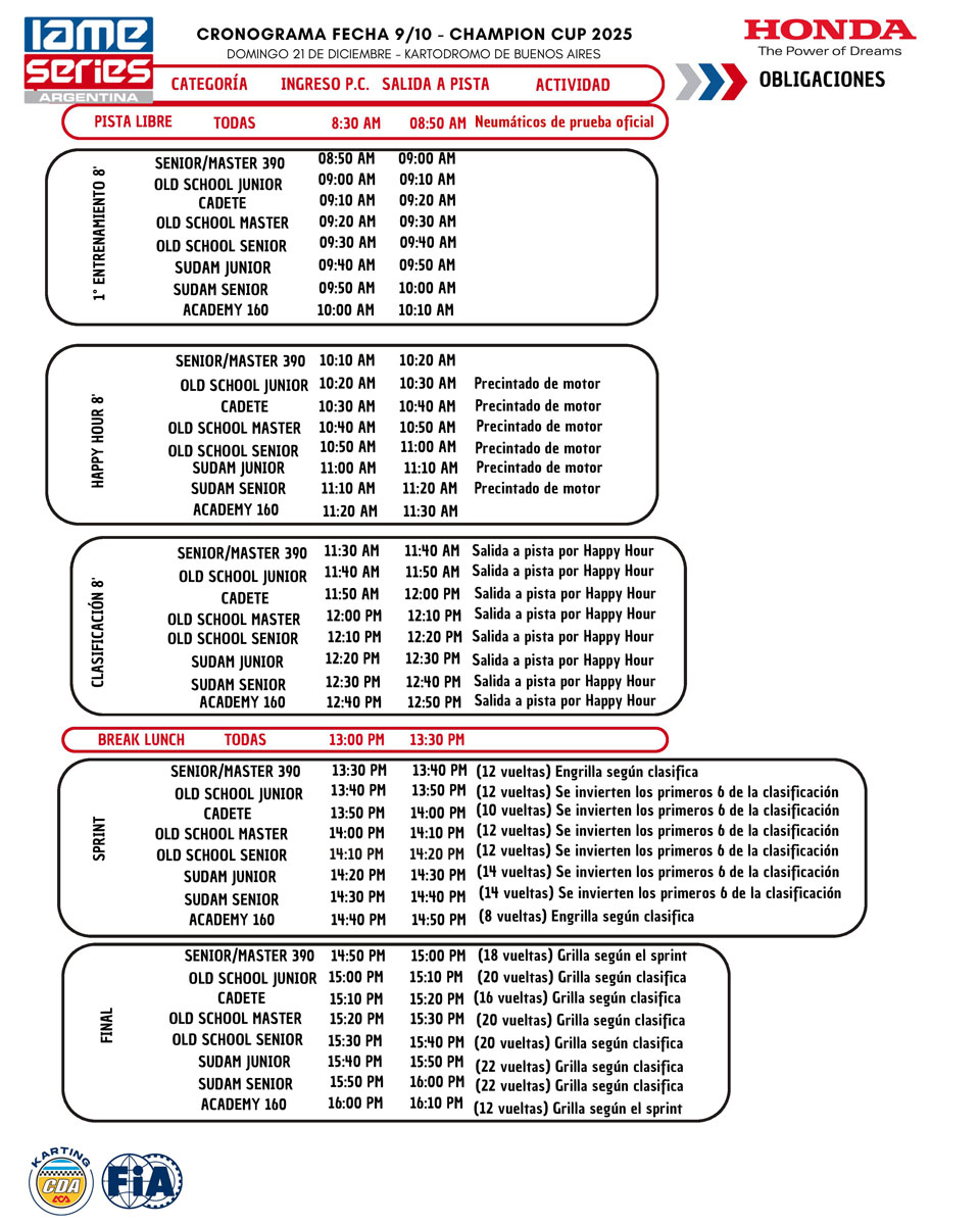 El domingo 21, el cronograma mantendrá el mismo formato y horarios, con clasificación, Sprint y finales para todas las categorías. El inicio de la jornada está previsto para las 08:50 y el cierre será cerca de las 16:10, cuando se dispute la última final del fin de semana. De esta forma, la IAME Series Argentina y la Copa Honda bajarán el telón de la temporada 2025 en el trazado porteño.