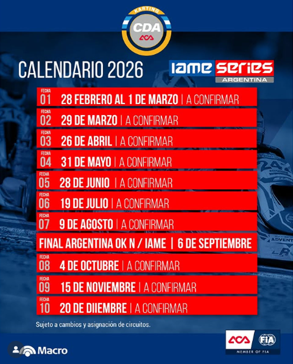 El calendario oficial establece competencias el 29 de marzo, 26 de abril, 31 de mayo, 28 de junio, 19 de julio y 9 de agosto, mientras que en 2026 incorporará la Final Argentina OKN/IAME que se disputará el 6 de septiembre, consolidando la llegada de la nueva motorización a este campeonato.