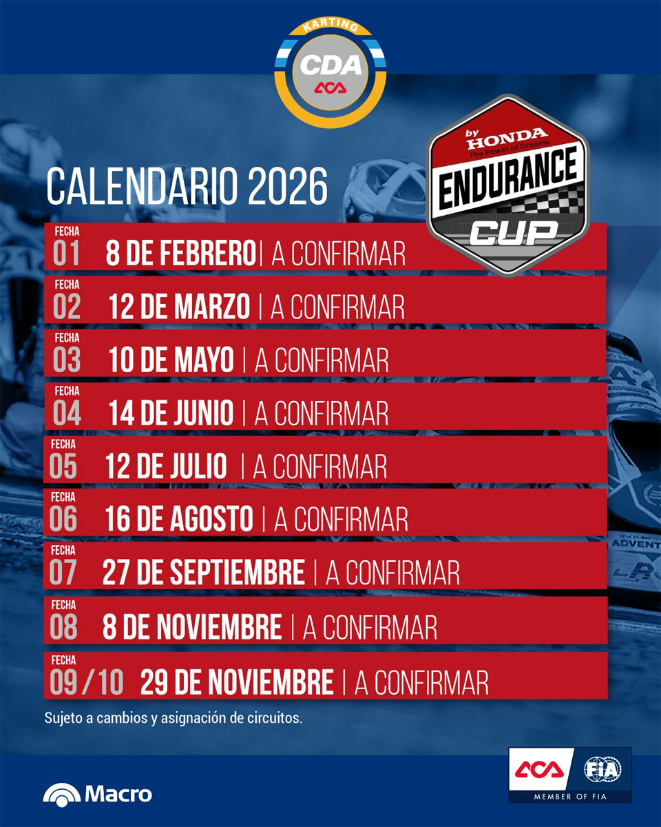 La Endurance Cup by Honda, bajo la órbita de CDA-Karting, presentó su calendario 2026 con fechas ya establecidas. El certamen desarrollará su temporada con escenarios que se confirmarán en los próximos meses.