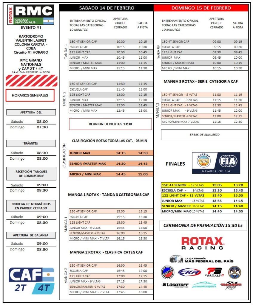 El domingo la jornada arrancará a las 09:00 con warm up general. Posteriormente se correrá la tercera manga para las Rotax y las series del CAF. Desde las 13:05 se pondrán en marcha las finales de cada categoría, cerrando el programa con la premiación a las 15:30.