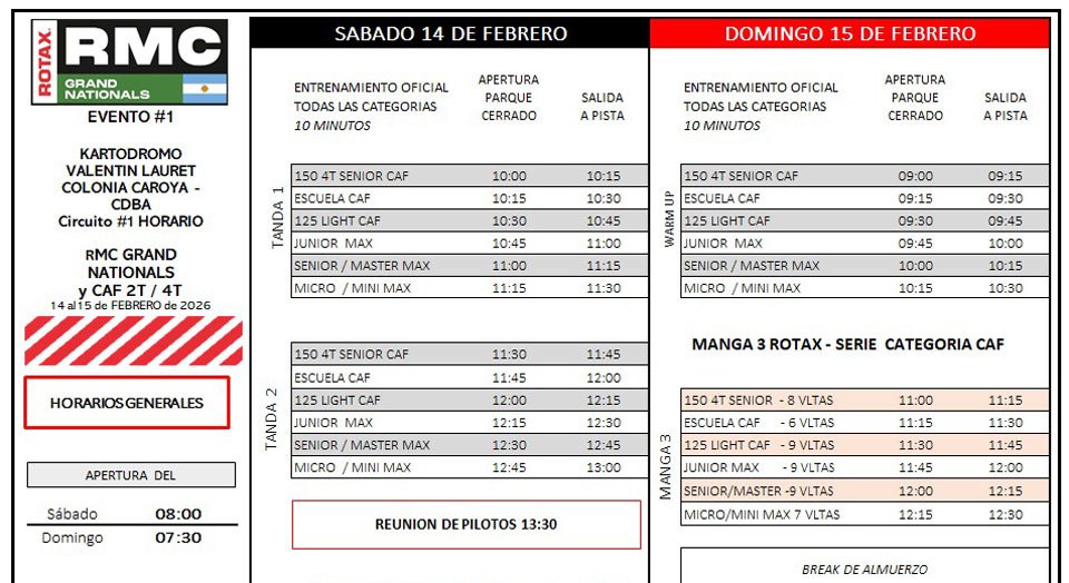 La programación ya fue confirmada y organiza dos jornadas bien diferenciadas. El sábado estará enfocado en entrenamientos, clasificaciones y las primeras mangas de las divisionales Rotax, mientras que el domingo quedará reservado para las series del CAF y la definición completa con todas las finales.