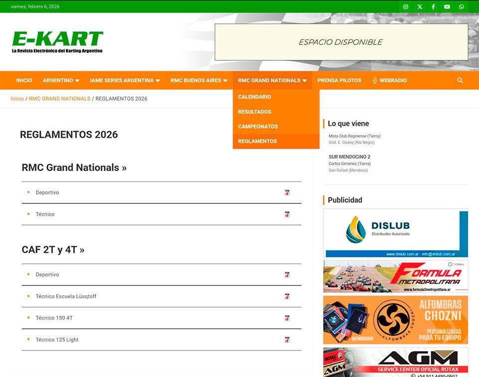 Todos los documentos están disponibles dentro de la sección exclusiva que E-Kart dedica a ambos campeonatos, centralizando la información en un solo lugar para facilitar el acceso y la consulta permanente. El ingreso puede realizarse desde https://e-kart.com.ar/rmc-grand-nationals/reglamentos-2026/ en el apartado de reglamentos de RMC Grand Nationals y CAF 2T y 4T.