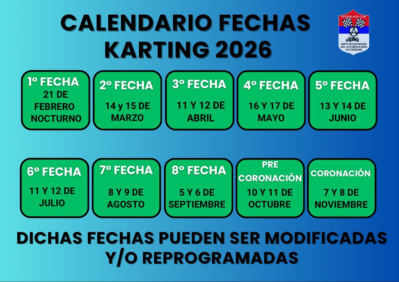 El Victoria Auto Club oficializó las fechas que compondrán el calendario 2026 del Karting Victoriense, el cual se desarrollará íntegramente en el circuito El Cerro de la Matanza, epicentro habitual de la actividad local y regional.