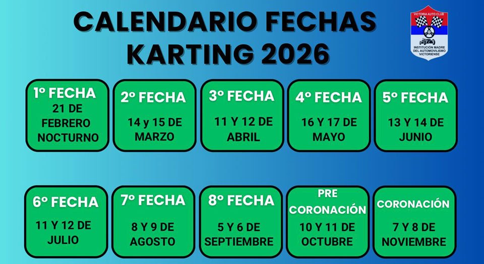 El Karting Victoriense ya tiene su hoja de ruta para la próxima temporada. El Victoria Auto Club confirmó el calendario 2026 con diez citas en El Cerro.