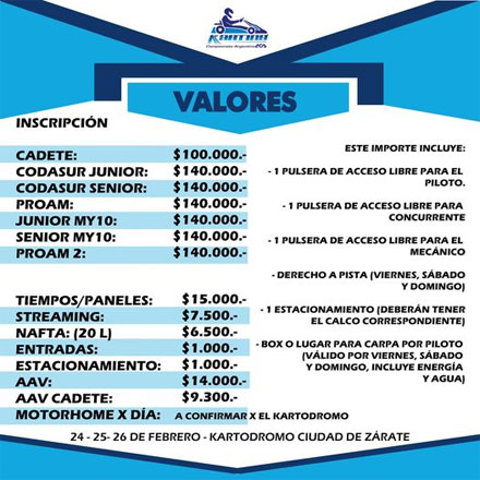 La organización del Campeonato Argentino de Karting dio a conocer los valores que tendrá cada divisional en los que respecta a inscripciones para el arranque de la Temporada 2023.