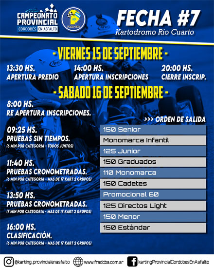 Una nueva fecha del Campeonato Provincial Cordobés de Karting en asfalto se correrá este próximo fin de semana en el Parque Ciudad de Río Cuarto, cuando se dispute la 7ª fecha de la temporada 2023.