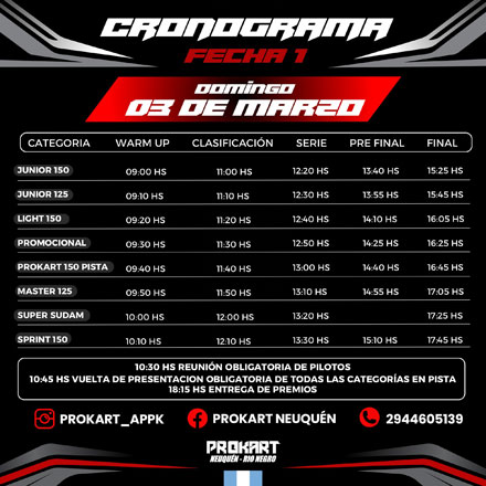 Las categorías serán Pro Kart 150cc. pista, junior 150cc., la flamante Light 150cc., Súper Sudam, master 125cc., junior 125cc., promocional y Sprint 150cc., las que cumplirán toda la programación el domingo, porque no se dividirá al menos en el comienzo la actividad por un tema de costos.