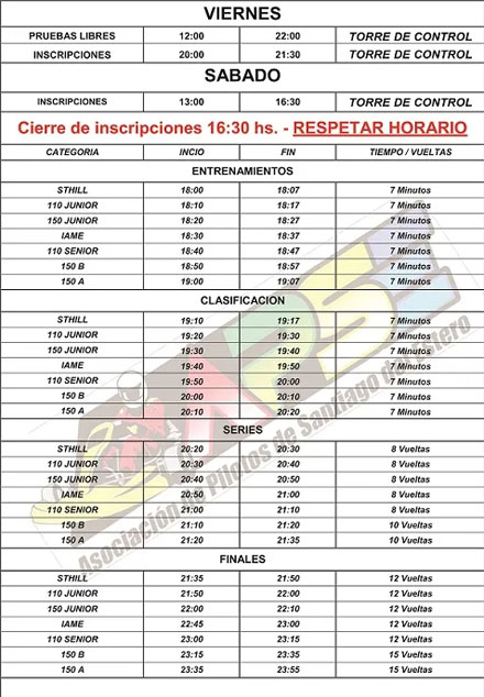 El cronograma oficial de la primera fecha, tendrá su punto de partida el sábado desde las 18 horas con las pruebas libres, las clasificaciones de todas las categorías desde las 19:10, las series desde las 20:20, mientras que las finales comenzarán aproximadamente a las 21:35 horas.