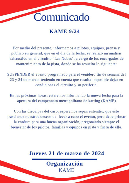 Se espera que esta decisión contribuya a garantizar la seguridad y la integridad de todos los involucrados en el evento, demostrando el compromiso del KAME con el bienestar de la comunidad kartista.