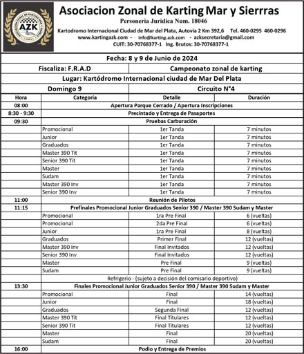 Este próximo sábado se desarrollaron los entrenamientos y pruebas clasificatorias, en tanto para este domingo quedaron las pruebas de carburación, a partir de las 9:30, y luego será eñ turno de las Pre-Finales, a partir de las 11:15: Promocional (dos, a 6 vueltas cada una); Junior (a 8 vueltas); Graduados (1ª final, a 12 vueltas); Master 390 (final invitados, a 12 vueltas); Senior 390 (final invitados, a 12 vueltas); Master (a 9 vueltas) y Sudam (a 9 vueltas).