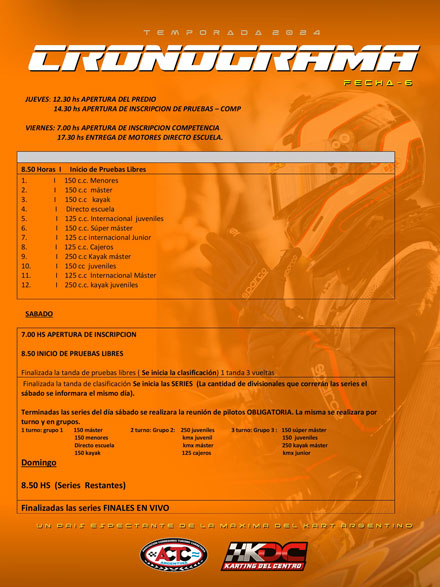 El cronograma de actividades comienza el jueves con la apertura del predio a las 12:30 y la inscripción para las pruebas de competición a las 14:30. El viernes, las inscripciones oficiales arrancan a las 7:00, y a las 17:30 se entregarán los motores para la categoría Directo Escuela. El sábado, las pruebas libres inician a las 8:50, seguidas de las clasificaciones y series. El domingo se llevarán a cabo las series restantes y las finales en vivo.