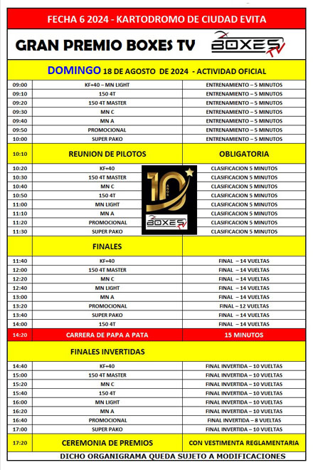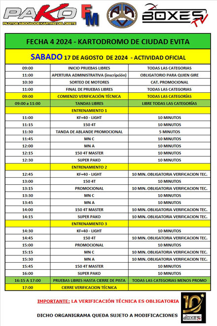 Las actividades comenzarán el sábado con los entrenamientos para todas las categorías, mientras que el domingo se llevarán a cabo las clasificaciones y las finales. Cabe destacar que, a partir de esta segunda mitad de la temporada, las categorías Mecánica Nacional C y Promocional no disputarán series, sino que correrán dos finales, al igual que el resto de las divisiones.