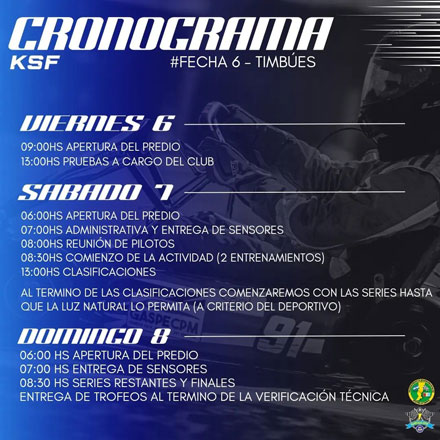 El fin de semana comenzará el viernes 6 con la apertura del predio a las 9:00 hs y pruebas a cargo del club. El sábado se abrirán las puertas a las 6:00 hs, seguido de la entrega de sensores y una reunión clave entre los pilotos y la organización. A partir de las 8:30 hs, se llevarán a cabo dos entrenamientos antes de dar paso a las clasificaciones a las 13:00 hs. La jornada continuará con las primeras series, siempre dependiendo de las condiciones de luz natural y bajo el criterio del equipo deportivo.