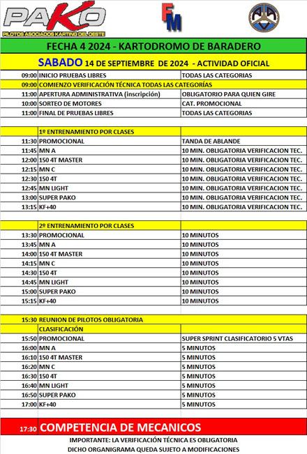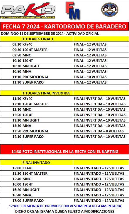 El día sábado comenzará la actividad con las prácticas de cada una de las categorías, como es habitual y a diferencia de otras competencias, durante la tarde se desarrollaran las clasificaciones, junto a un súper sprint clasificatorio de la divisional Promocional.