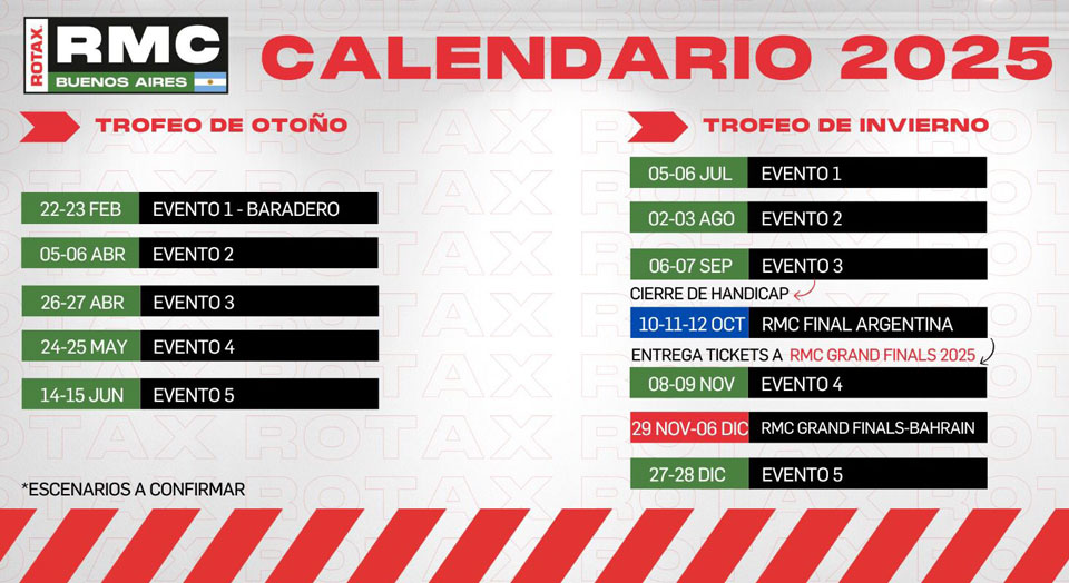 El calendario 2025 de RMC Buenos Aires ya está definido e incluye dos certámenes: el Trofeo de Otoño y el Trofeo de Invierno. Ambas competencias cuentan con fechas distribuidas a lo largo del año, con escenarios aún por confirmar en la mayoría de los casos.