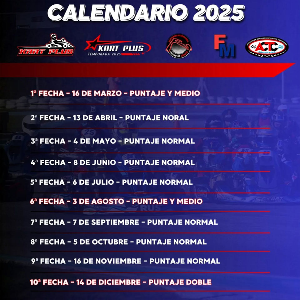 Kart Plus anunció el calendario oficial para la temporada 2025, que contará con diez fechas distribuidas entre marzo y diciembre. La categoría, fiscalizada por la FRAD Metropolitana y dependiente de la ACTC, promete un campeonato competitivo y bien estructurado.