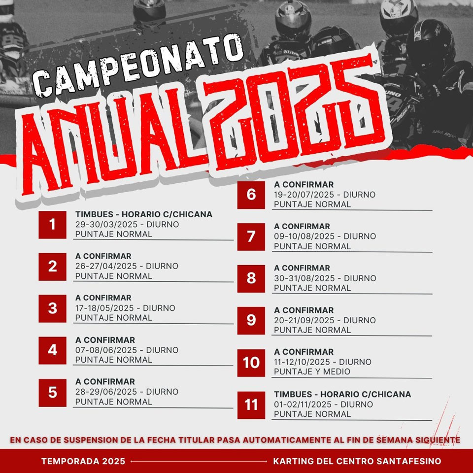Respecto al campeonato anual 2025, el mismo contará con 11 fechas diurnas distribuidas en Totoras, Timbúes y otros dos circuitos a confirmar. El inicio será el 29 y 30 de marzo en Timbúes (trazado horario con chicana), y las competencias continuarán regularmente hasta el cierre previsto para el 1 y 2 de noviembre, nuevamente en Timbúes.