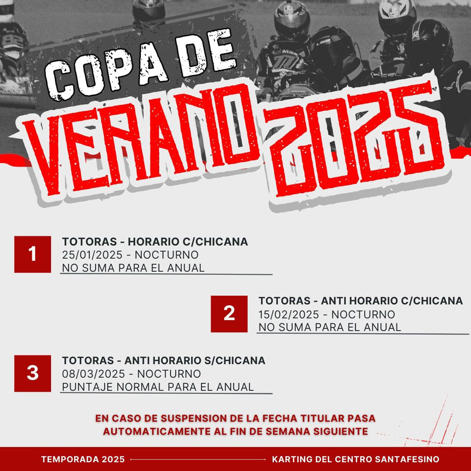 La Copa de Verano 2025 se llevará a cabo íntegramente en el circuito de Totoras, con tres fechas nocturnas: el 25 de enero (trazado horario con chicana), el 15 de febrero (trazado antihorario con chicana) y el 8 de marzo (trazado antihorario sin chicana). Cabe destacar que la última fecha también sumará puntaje para el campeonato anual.