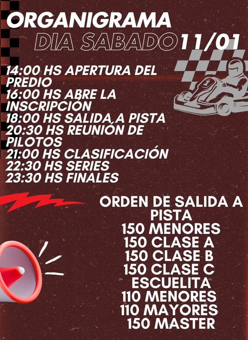 El cronograma oficial del sábado establece la apertura del predio a las 14:00 horas, mientras que las inscripciones estarán habilitadas desde las 16:00. Las primeras salidas a pista están previstas para las 18:00, con clasificaciones a las 21:00, series a las 22:30 y finales desde las 23:30.