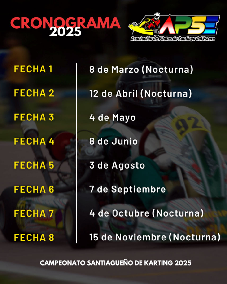 La Asociación de Pilotos de Santiago del Estero (APSE) presentó el calendario del Campeonato Santiagueño de Karting 2025, que contará con ocho fechas puntuables entre marzo y noviembre. La temporada incluirá carreras tanto diurnas como nocturnas.
