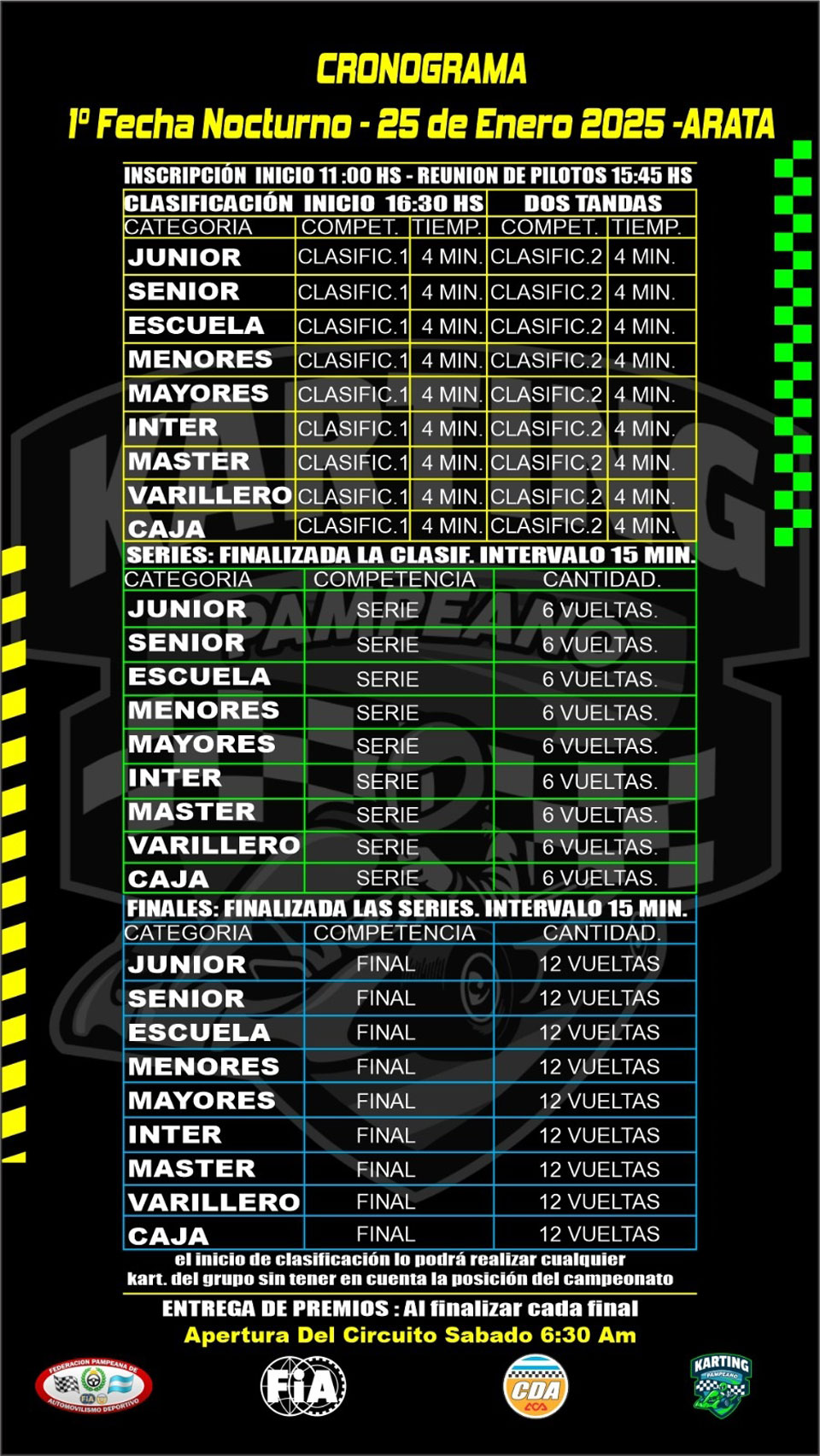 El cronograma de actividades incluye clasificación, series y finales para las nueve categorías presentes: Junior, Senior, Escuela, Menores, Inter, Máster, Varillero, Caja y Mayores. Cada categoría tendrá su respectivo esquema de competencia, iniciando con dos tandas de clasificación de 4 minutos por piloto. Posteriormente, se disputarán las series de 6 vueltas para los pilotos de Junior, Senior, Escuela, Menores, Inter y Máster; mientras que Varillero, Caja y Mayores completarán 8 vueltas en sus series.