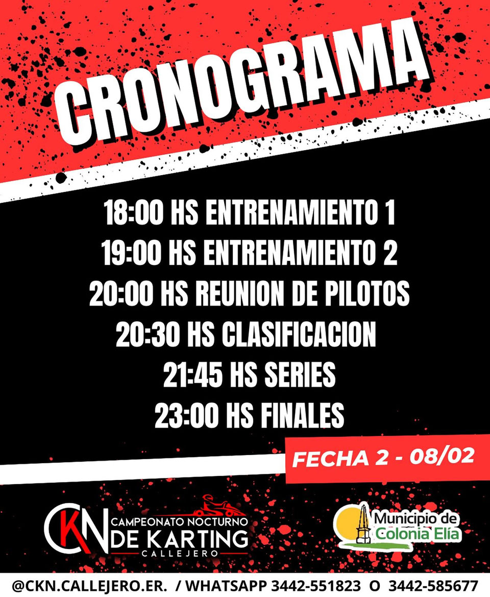 La segunda fecha del Campeonato Nocturno de Karting Callejero, que se correrá este jueves 8 de febrero en Colonia Elía, ya cuenta con su cronograma oficial.