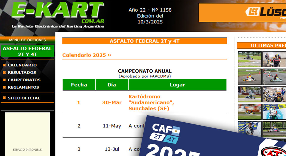 Para acompañar su crecimiento, el torneo ya cuenta con su propia sección dentro de E-Kart.com.ar, disponible en el menú principal bajo Categorías -> CAF 2T y 4T. Allí se podrá consultar el calendario completo, los resultados de la última competencia, el campeonato extraoficial actualizado, los reglamentos y un enlace directo a su sitio web y redes sociales.