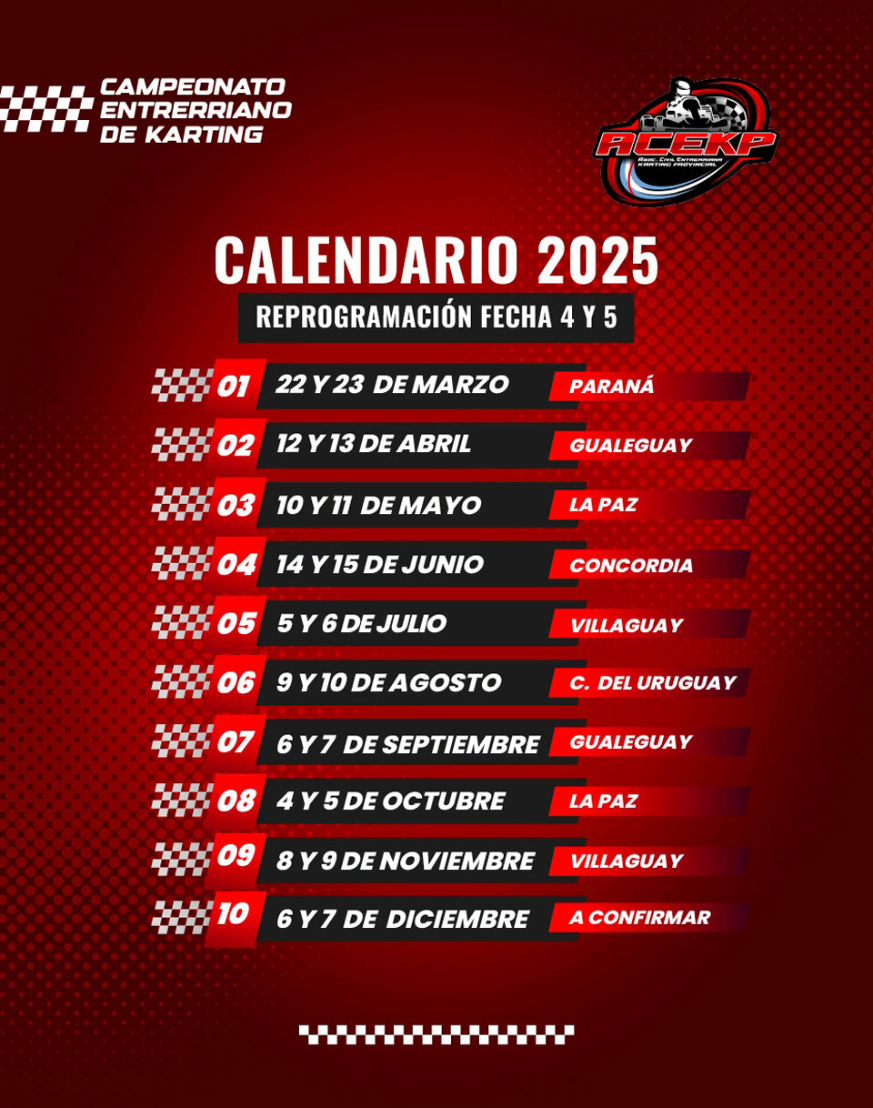 La Asociación Civil Entrerriana de Karting Provincial (ACEKP) informó oficialmente un intercambio de sedes para las fechas 4 y 5 del certamen. Si bien se mantienen las jornadas del 14 y 15 de junio, y del 5 y 6 de julio, se invierten los escenarios originalmente anunciados.
