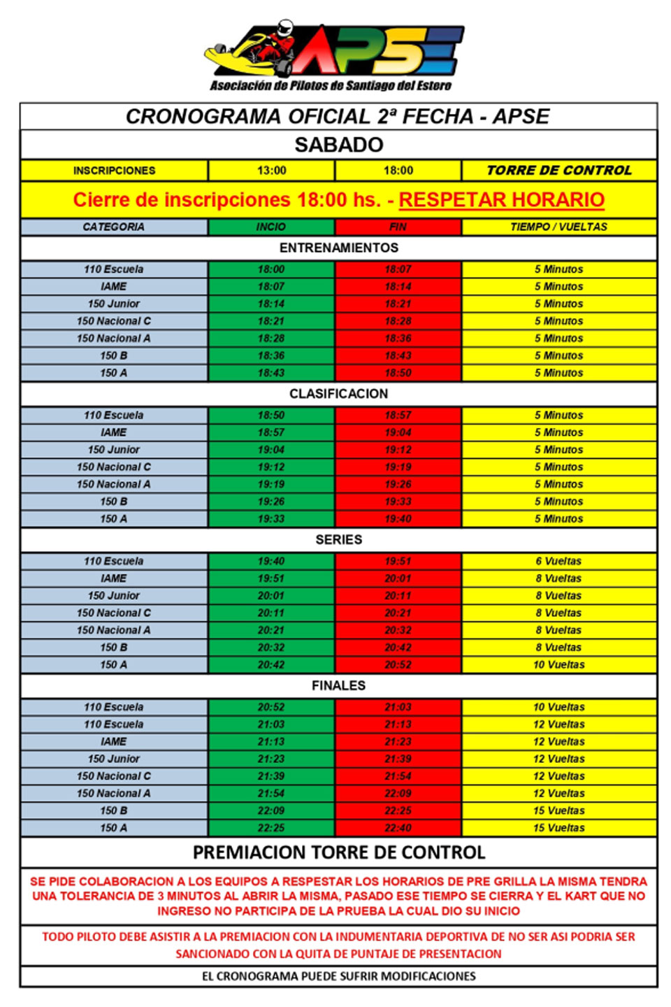 La actividad oficial de esta segunda fecha se pondrá en marcha desde este viernes 11 de abril por la noche, con las tandas libres no oficiales programadas entre las 19:00 y las 22:00 horas. El sábado será el turno de la jornada de entrenamientos, clasificación, series y finales, cerrando la programación con la ceremonia de premiación.